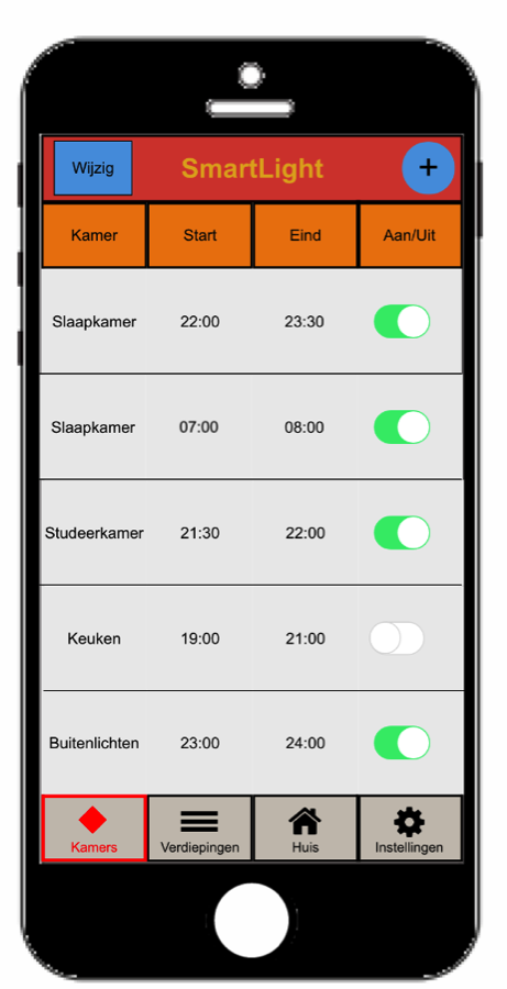 Op de volgende pagina geef ik een indicatie van hoe de app er op een iPhone 6 uit zou kunnen zien en hoe die gebruikt zou kunnen worden. Dit zal ik hier toelichten. Deze gebruiker van de SmartLight app heeft er hier voor gekozen om het licht in de individuele kamers van het huis te configureren. In de bovenste rij staan de categorieën die men kan aanpassen: de kamer, de starttijd waarop het licht langzaam aan gaat, en de eindtijd waarop het licht uit moet zijn. In de laatste kolom staat ingesteld of men deze configuratie daadwerkelijk wil inschakelen. Deze gebruiker wil dat het licht in de slaapkamer vanaf 22:00 langzaam uit gaat, zodat hij of zij vanaf dat moment rustig in slaap kan dommelen. Om 23:30 is het licht helemaal uit. In diezelfde slaapkamer gaat het licht vanaf 07:00 uur ’s ochtends langzaam aan. Zodoende kan deze gebruiker op een natuurlijke manier wakker worden. Om 08:00 uur moet de gebruiker opstaan.